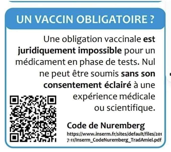 je suis comme chacun d'entre vous. J'ai une vie et cette vie sera indéniablement bouleversée par le choix inconfortable de ne pas céder au chantage abject de nos dirigeants.Hier, j' ai entendu des gens parler près de moi et lancer avec rage : "S'ils ne veulent pas se faire vacciner, qu'ils restent chez eux et qu'ils crèvent !". Peut-être qu'ils ont raison et que je vais crever d'un virus qui, selon l'institut Pasteur, touche 0,001% chez les moins de 20 ans à 8,3% chez les 80 ans et plus.Mais je préfère écouter un prix Nobel de médecine qui dit que les vaccins créent les variants plutôt qu'un banquier qui dit que nous sommes en guerre.Je préfère écouter une généticienne à la retraite qui dit que les vaccins à ARN sont dangereux pour notre ADN plutôt qu'un journaliste de BFM TV qui ne veut pas perdre son salaire et nous dit que les non vaccinés sont des irresponsables.Je préfère m'en référer aux textes fondateurs qui nous parlent de liberté plutôt qu'à des politiques à la solde des laboratoires pharmaceutiques qui nous parlent d'argent.