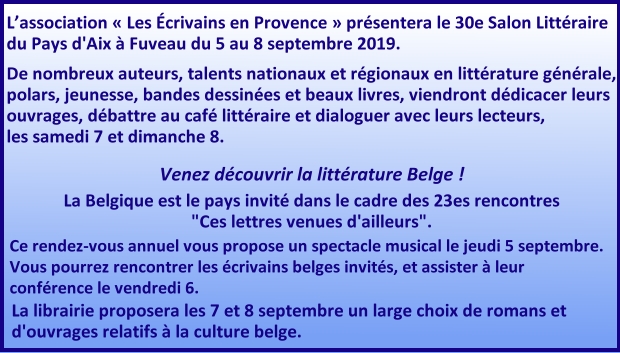 Plus question de se dorer la pilule sous les sunlights des tropiques… Venez me voir au festival du livre de Fuveau pour cette nouvelle rentrée littéraire ! Cette année, c'est la Belgique qui sera à l'honneur. De nombreux auteurs et dessinateurs un peu cinglés comme moi viendront dédicacer leurs ouvrages et débattre au café littéraire. Alors si vous êtes dans le coin, rejoignez-nous !