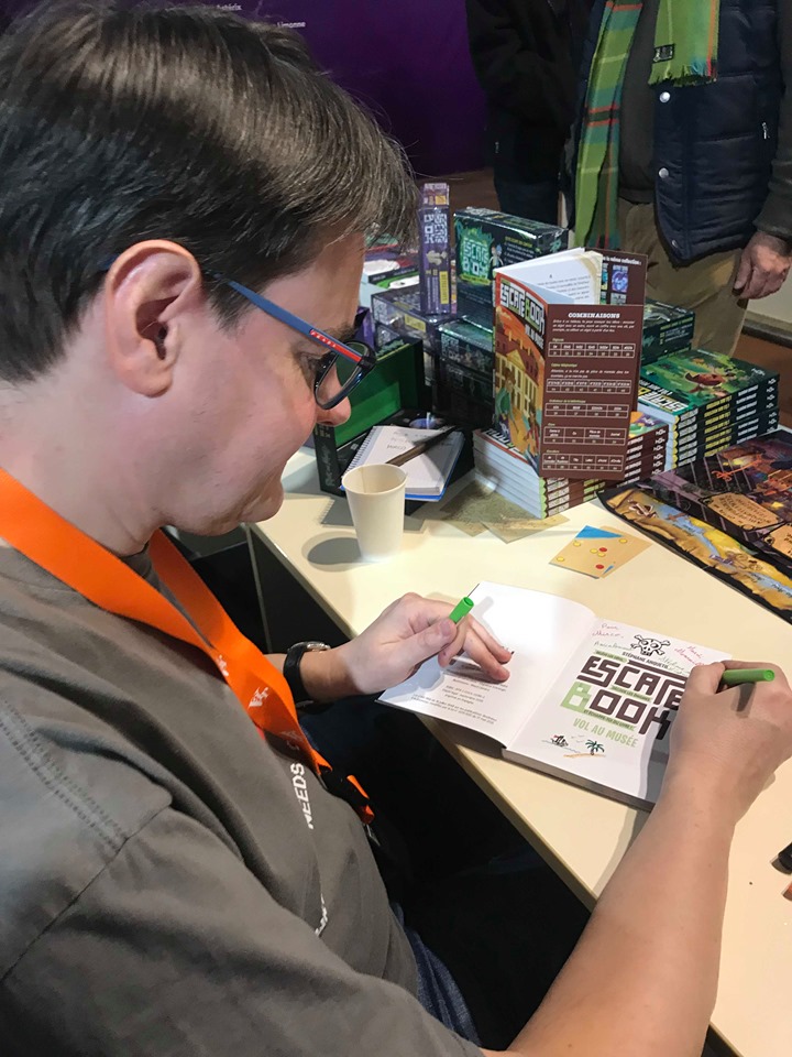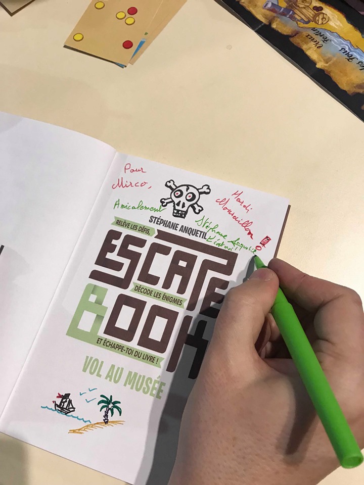 Samedi midi, j'ai pris le temps d'aller manger dans un délicieux restaurant avec le scénariste Stéphane Anquetil, qui m'a dédicacé son bouquin pour enfants. J'adore le concept de ces romans d'escape game, où les lecteurs doivent décoder les énigmes et, en quelque sorte, s'échapper du livre !