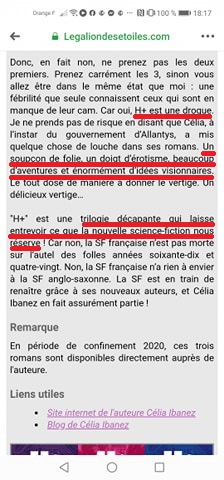 "H+ est une drogue !", "une trilogie décapante", " un univers d'une richesse à couper le souffle", "énormément d'idées visionnaires"... J'ai eu le plaisir de découvrir ce 18 avril sur l'excellent site de SF Le Galion des Étoiles une fiche de lecture dithyrambique sur ma trilogie H+. Un grand merci à l'autrice de cet article (je vous jure que je ne l'ai pas payée ! ) qui me redonne du cœur à l'ouvrage en cette période de confinement que je vis moyennement bien… Pour info, Hélène DG est romancière de science-fiction mais elle est également éditrice.