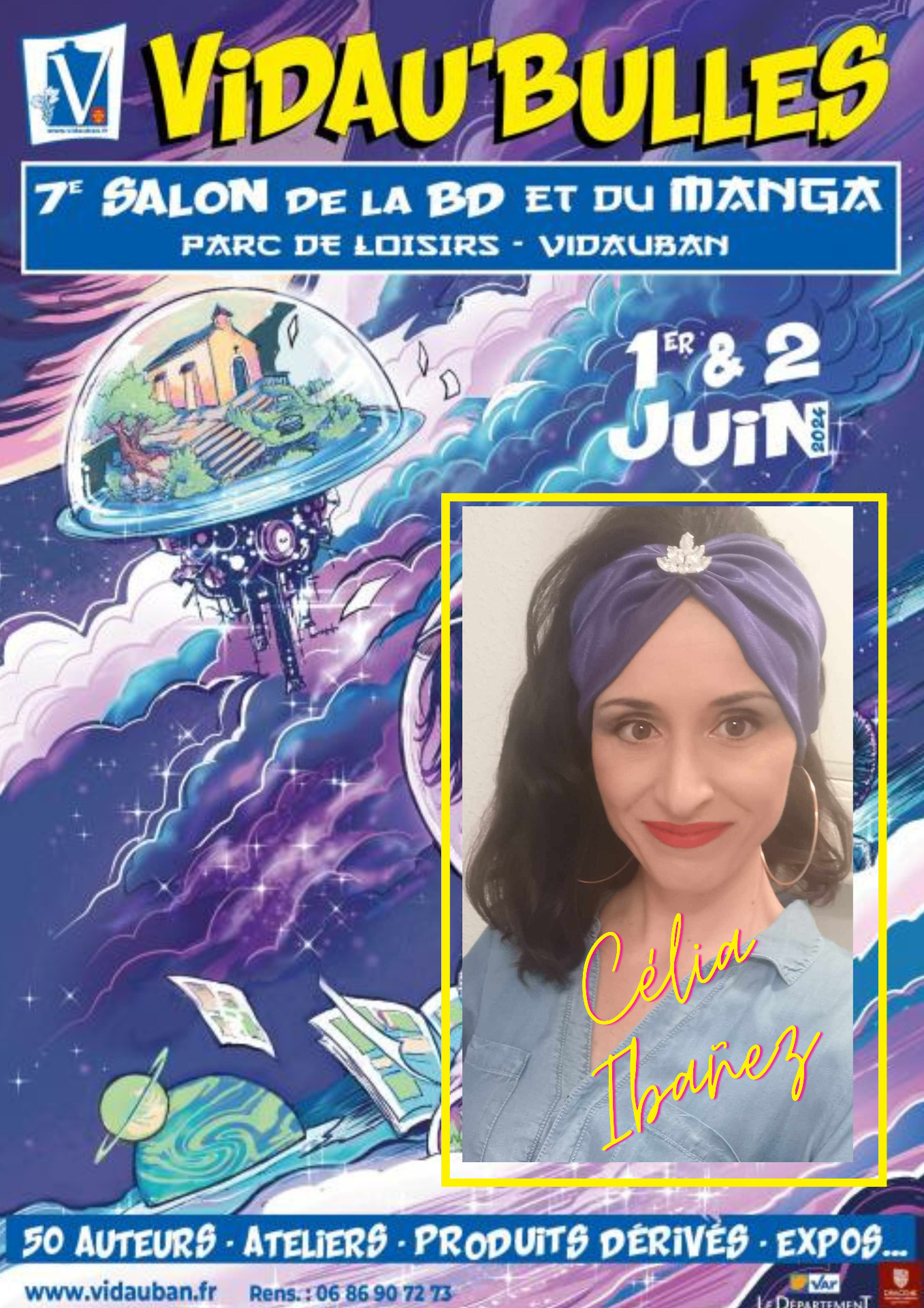 Comme chaque année, je serai présente au salon de la bande dessinée et du manga à Vidauban (Var). Pour la septième édition de son salon de la BD, Vidauban, sympathique petite ville du Var située sur la RN 7 (à seulement 15 minutes de l'autoroute), invite une quarantaine d'auteurs, scénaristes et illustrateurs venus de toute la France, à présenter et dédicacer leurs œuvres, le samedi 1er et dimanche 2 juin 2024, de 10 h à 18 h, en plein air au Parc de Loisirs Dracénie Provence !